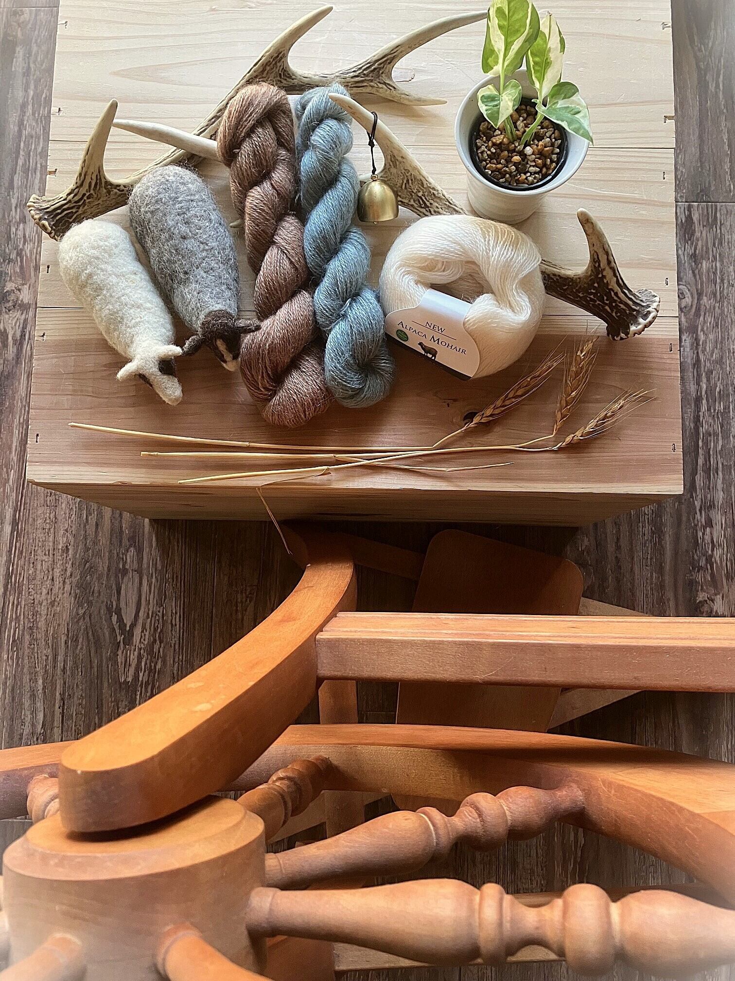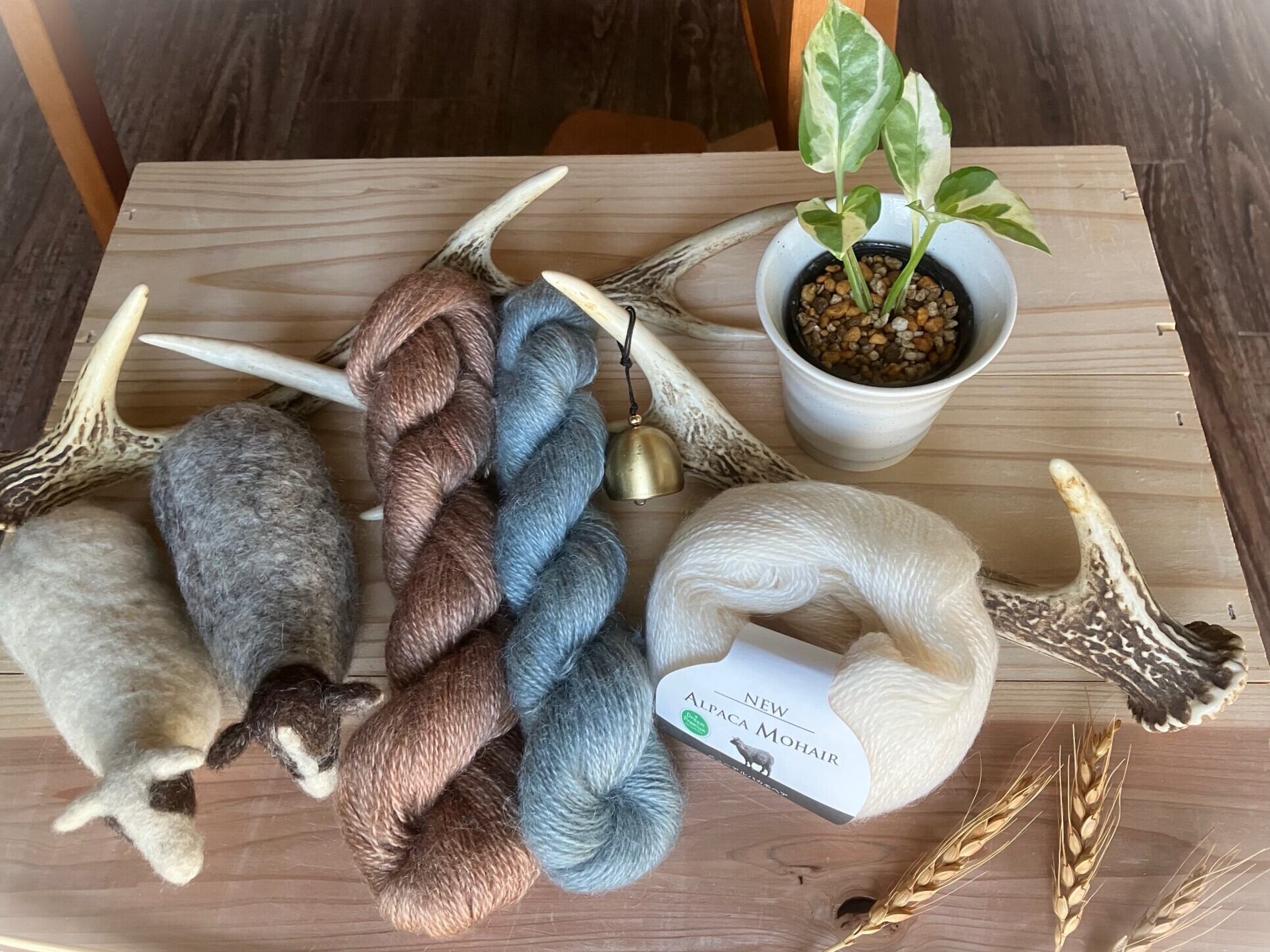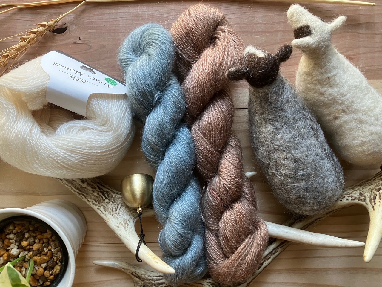 こちらの毛糸はアルパカモヘアの生成り水色ベージュ3色 各色100g合計300gのセット商品になります。水色もベージュも藍で染めた植物染め毛糸になります。